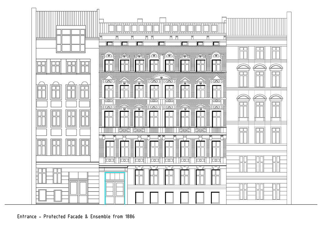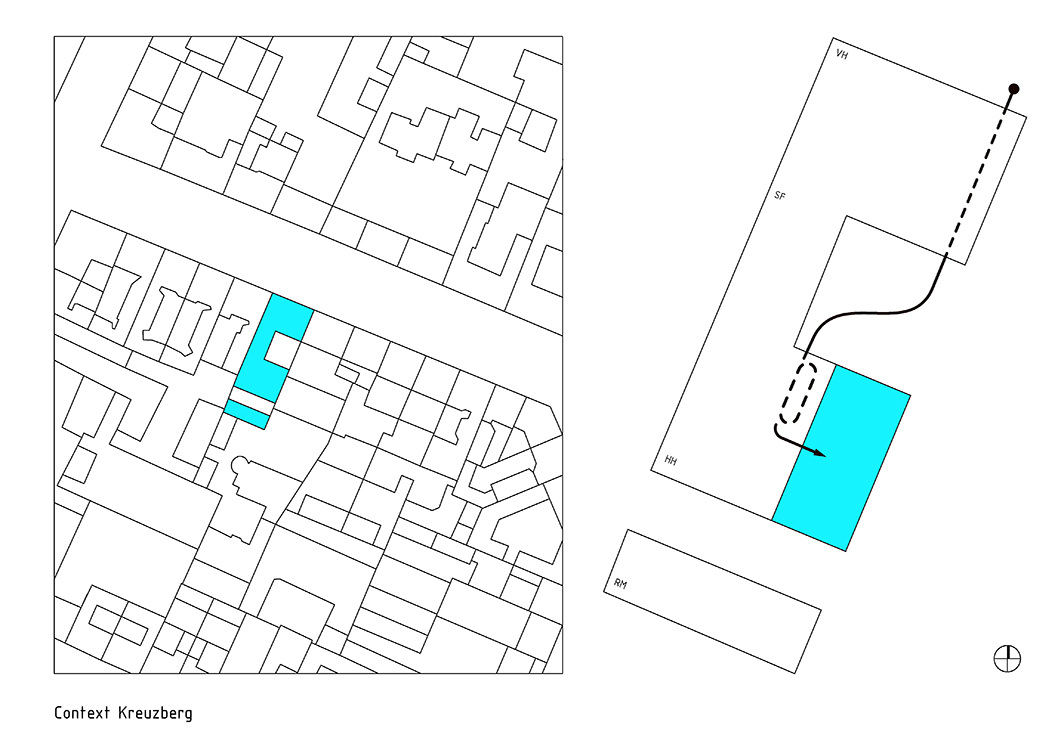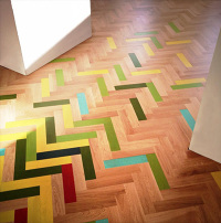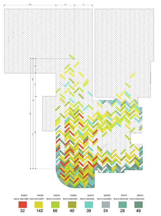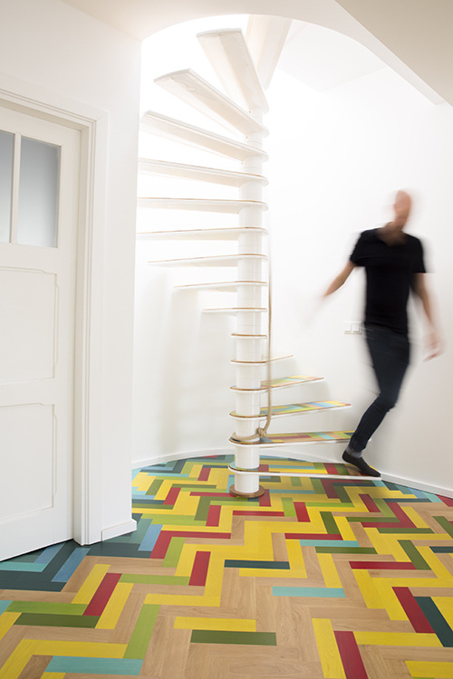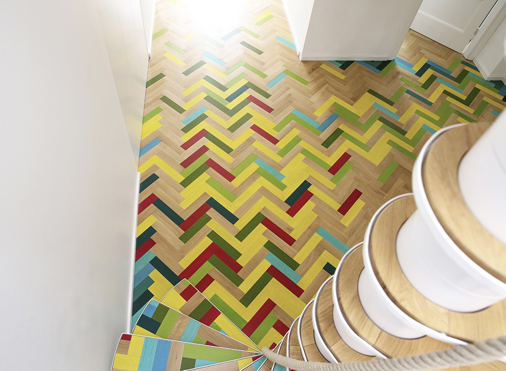 Das Hinterhof Ensemble des Kreuzberger Kiezes mit seinen typischen wild bewachsenen Brandwänden dient als lokale Referenz für den Entwurf des Holzfußbodens der 4. Etage. Der wild wachsende Wein verwandelt die "Brandwand" in ein sich ständig veränderndes Naturerlebnis. Die unterschiedlichen Wachstumsmuster mit seinen graduellen Farbänderungen inspirierten das Layout des Holzfußbodens. Das Muster beginnt im oberen Teil der Treppe und wächst dann weiter nach unten in den Wohnbereich der 4. Etage hinein. Mit seinem Verlauf zeichnet es die Hauptverkehrswege der Bewohner nach und läuft dann zu den unterschiedlichen Räumen hin graduell aus.