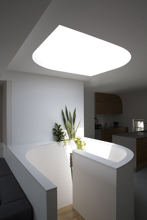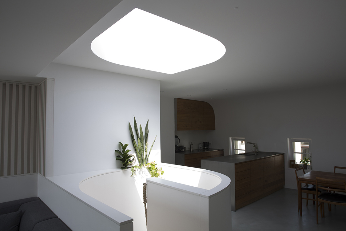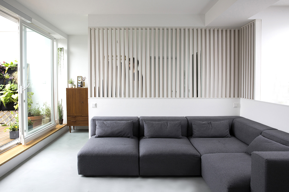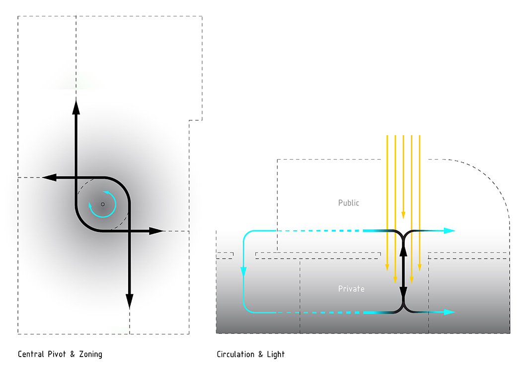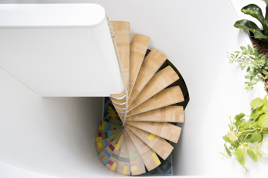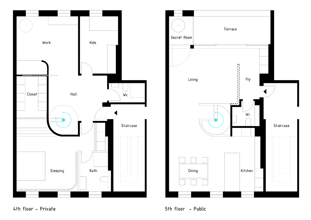 Die 4. Etage ist als "Private Zone" der Wohnung gedacht und beinhaltet die ruhigeren, zurückgezogenen Bereiche wie Schlaf- und Badezimmer für die Familie und Räume zum Arbeiten und Entspannen. Die 5. Etage hingegen ist als "Öffentliche Zone" konzipiert, in dem sich ein großes Studio mit offener Küche, Essbereich und Wohnzimmer befindet, das sich über eine Terrasse nach außen erweitert.
