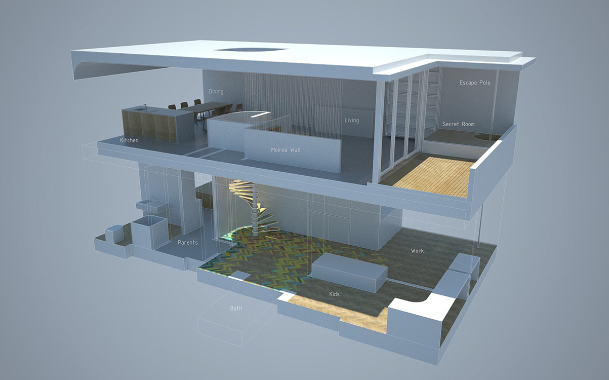 Das Thema des Brandschutzes und der Fluchtwege inspirierte zur Ausbildung einer Feuerwehrstange als Abkürzung aus dem Geheimzimmer der 5. Etage in den Arbeitsraum der 4. Etage. Die Feuerwehrstange ermöglicht im Zusammenhang mit der zentralen Treppe einen effizienten Rundlauf innerhalb der Wohnung. Das Geheimzimmer ist durch eine Schrankwand vom Wohnzimmer abtrennbar und ermöglicht somit einen unbemerkten Rückzugsort für Bewohner und Gäste.