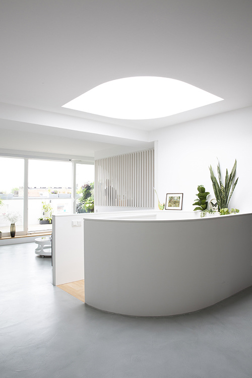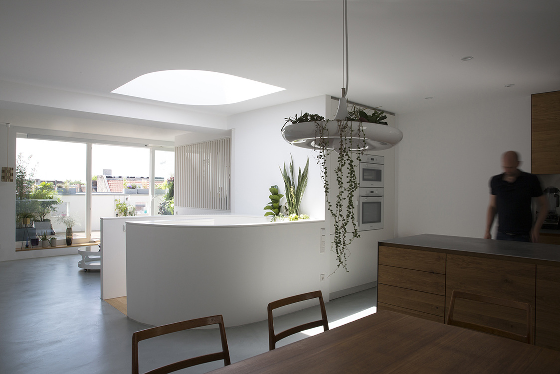 HAUS JJ - is build into the 4th and 5th floor as extended roof located in Berlin-Kreuzberg. The apartment is organized around a central pivot point that defines the different areas for living and circulating. The pivot point is designed and constructed as stair with skylight that operates as one big integrated furniture piece connecting the two floors with each other.