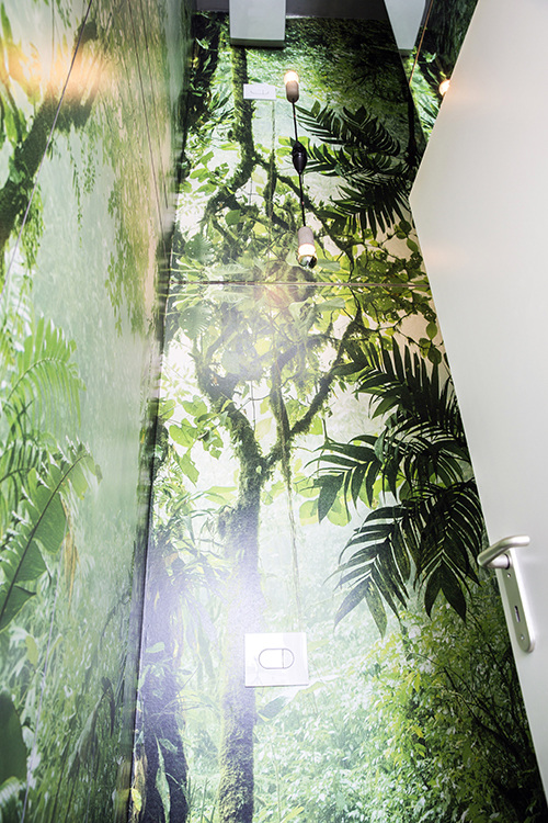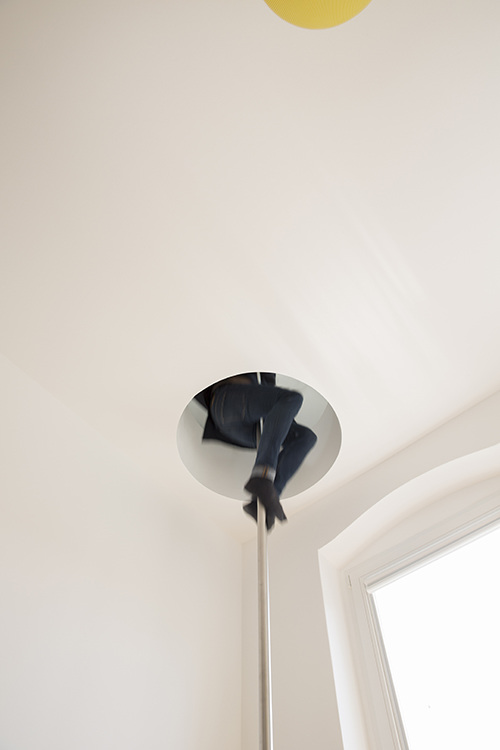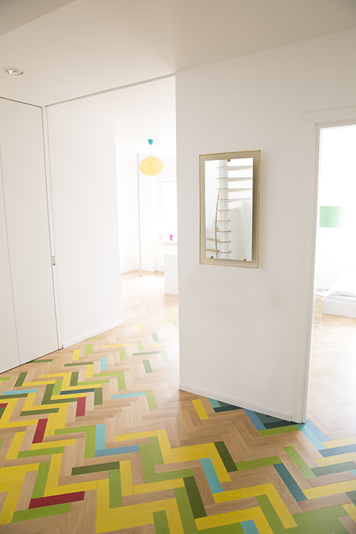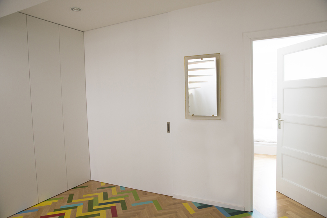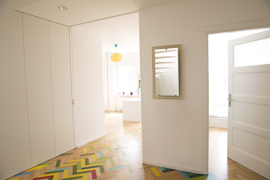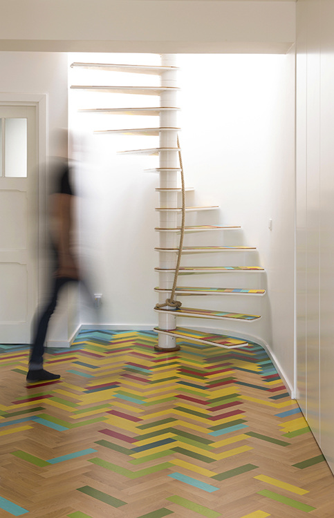 The backyard ensemble of Kreuzberg with it’s typical „Brandwand“ (firewalls) is a local reference for the wooden floor design of the apartment. A wild wine plant is growing along the „Brandwand“ turning it into a green wall. The growth pattern inspired the layout of the wooden floor pattern marking the main circulation routes of the inhabitants moving down the stair through the 4th floor of the apartment. The theme of the fire wall and escape routes was taken further to build a short cut from the secret room on 5th floor to the working space on 4th floor. The fire pole creates an efficient and easy-to-use circulation loop between the two floors.